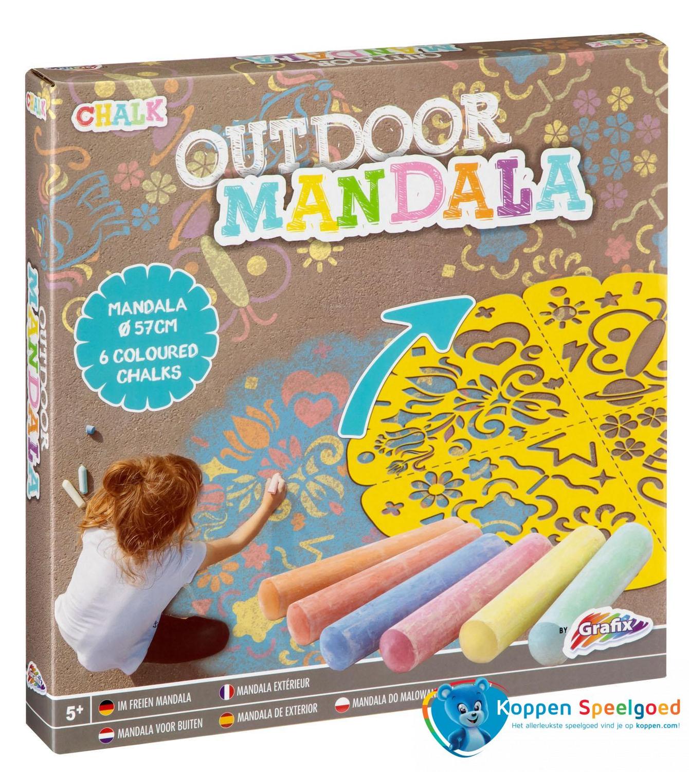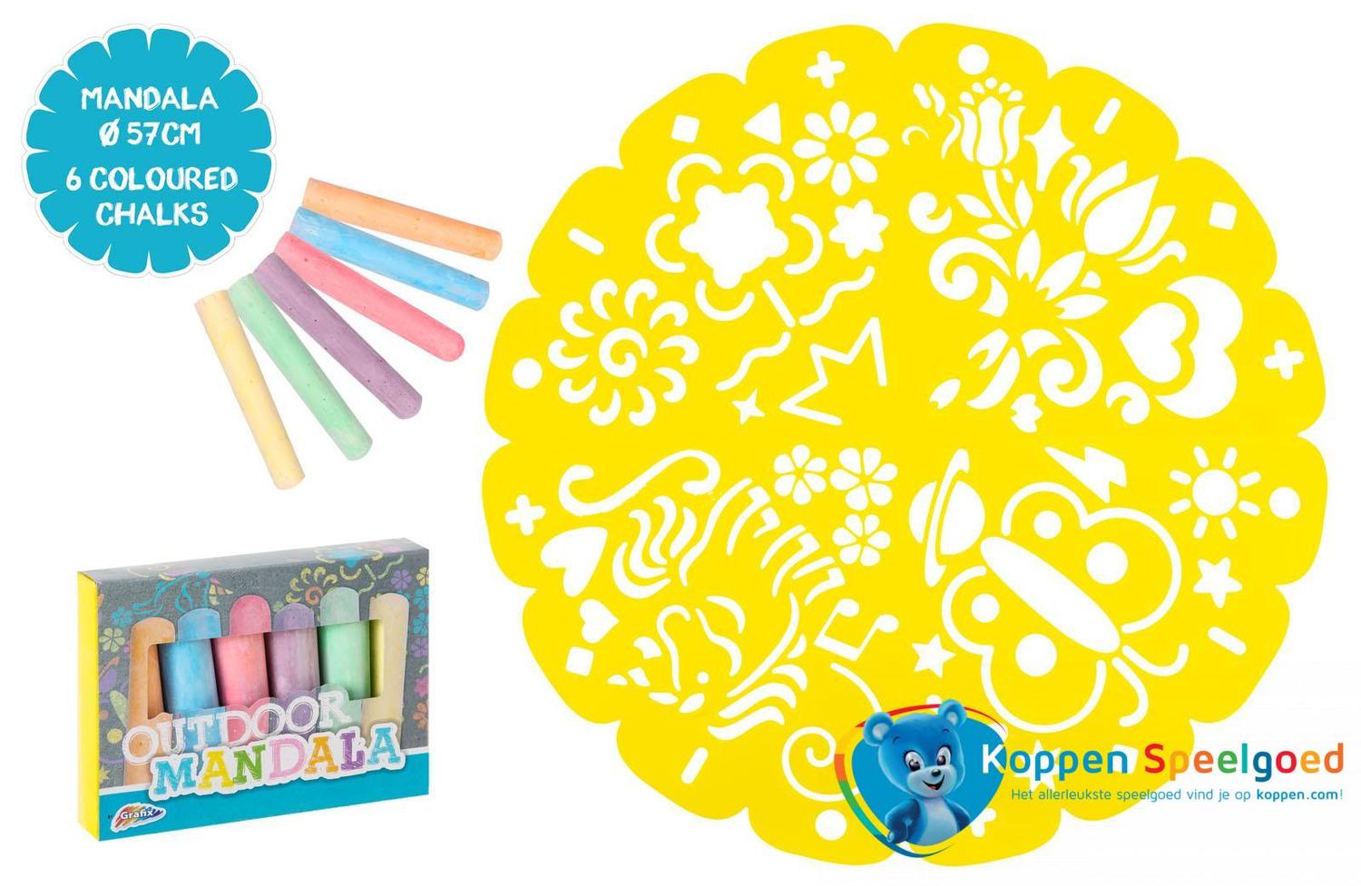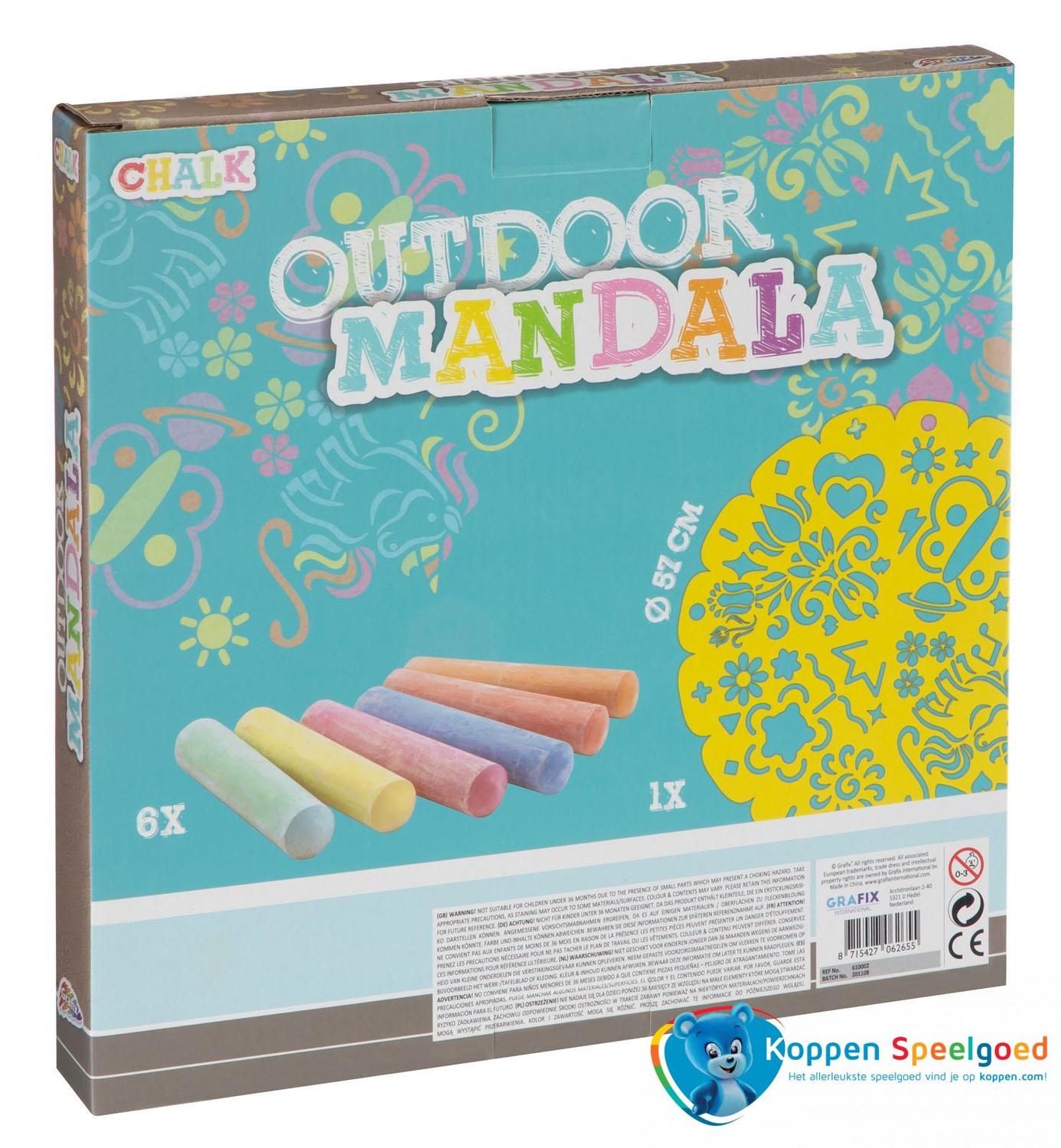 Een mandala met stoepkrijt maken is een feest met deze doos van Grafix! Er zit een speciale mal bij waarmee je in een handomdraai een mooie mandala kunt krijten. In de doos vind je ook nog 6 mooie staven stoepkrijt in verschillende kleuren. De mal van de mandala is 57 cm in diameter en heeft vier verschillende patroonmogelijkheden.