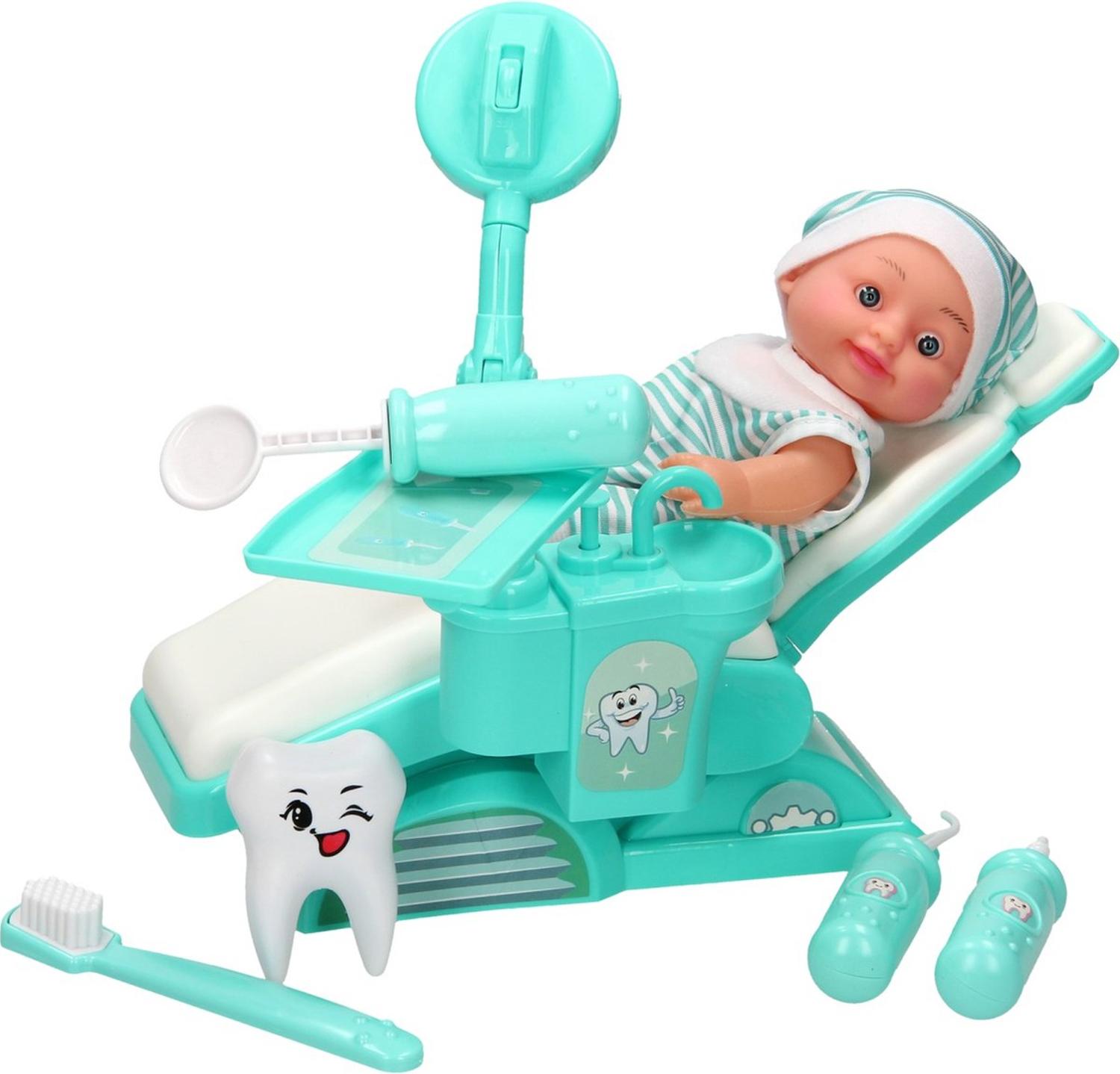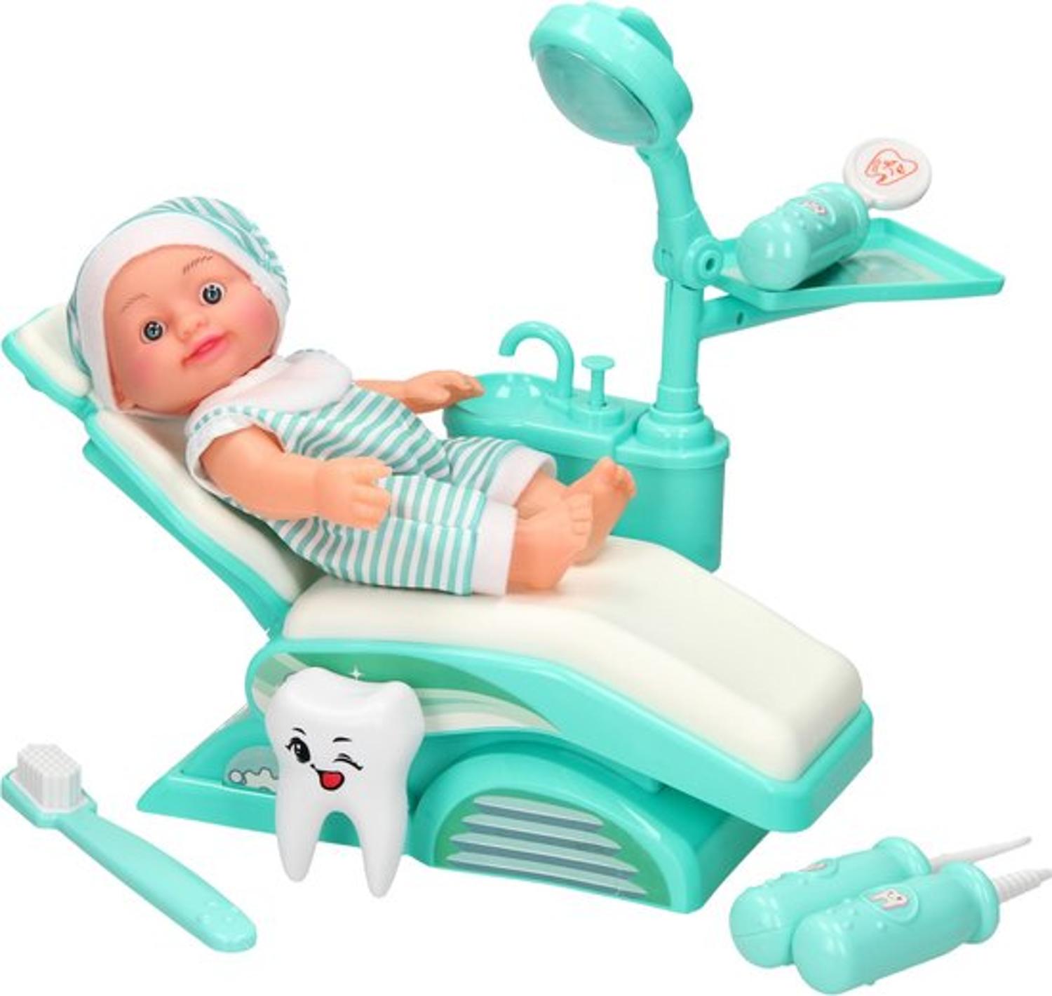 Tandarts speelset met o.a. pop, tandartsstoel, boor, tandenborstel, spiegeltje, haakje en model van een vergrote kies. Met echt werkende lamp. De batterijen voor de lamp zitten er al in.