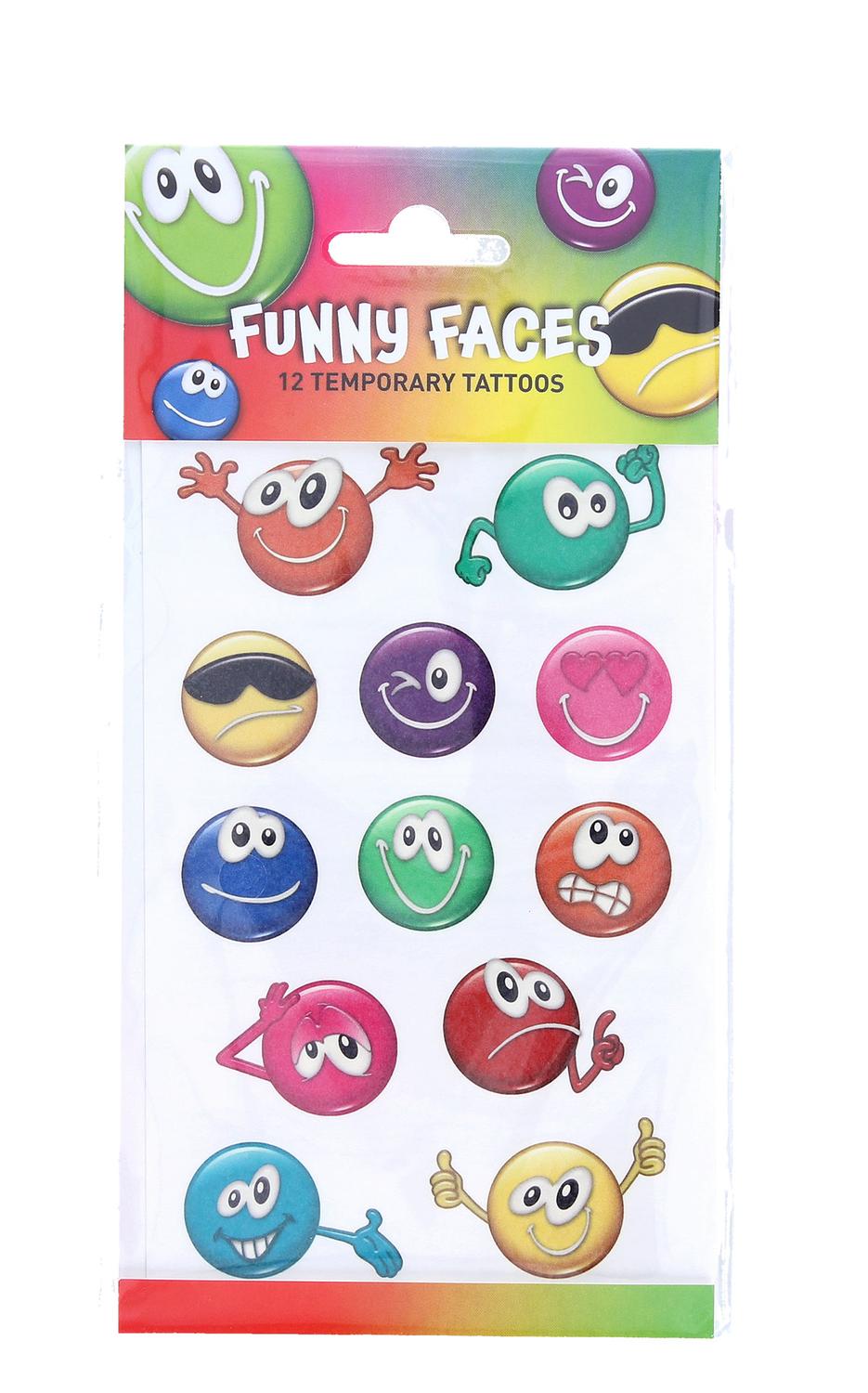 Vel met 12 tijdelijke tattoo-stickers van grappige gezichtjes. Lees goed de instructies achterop.