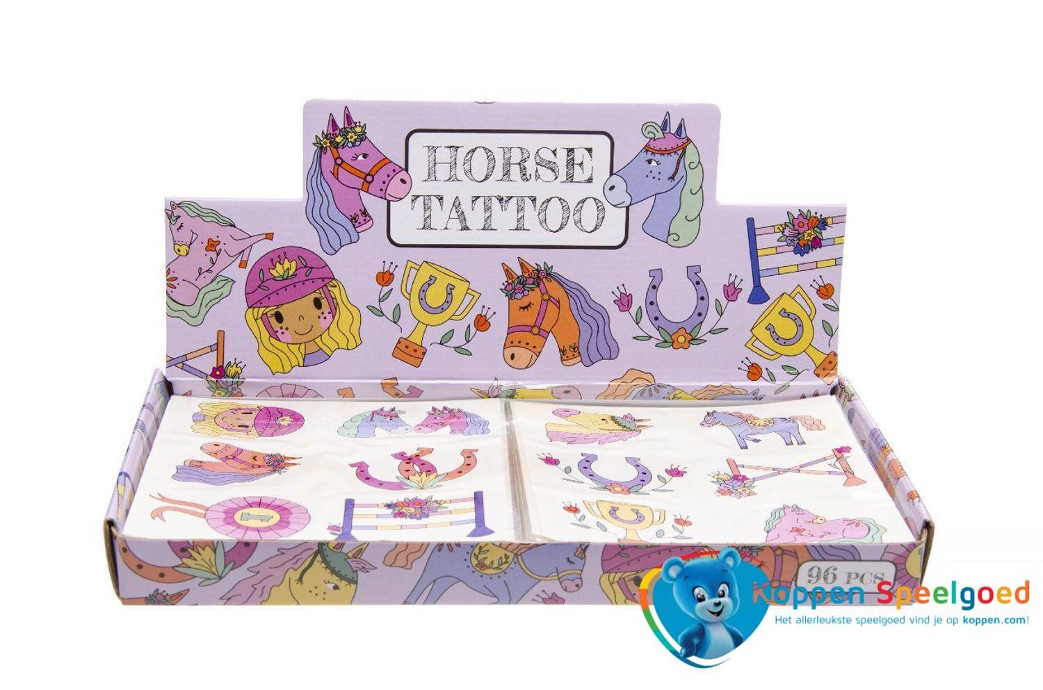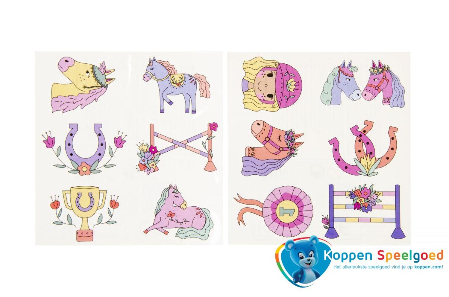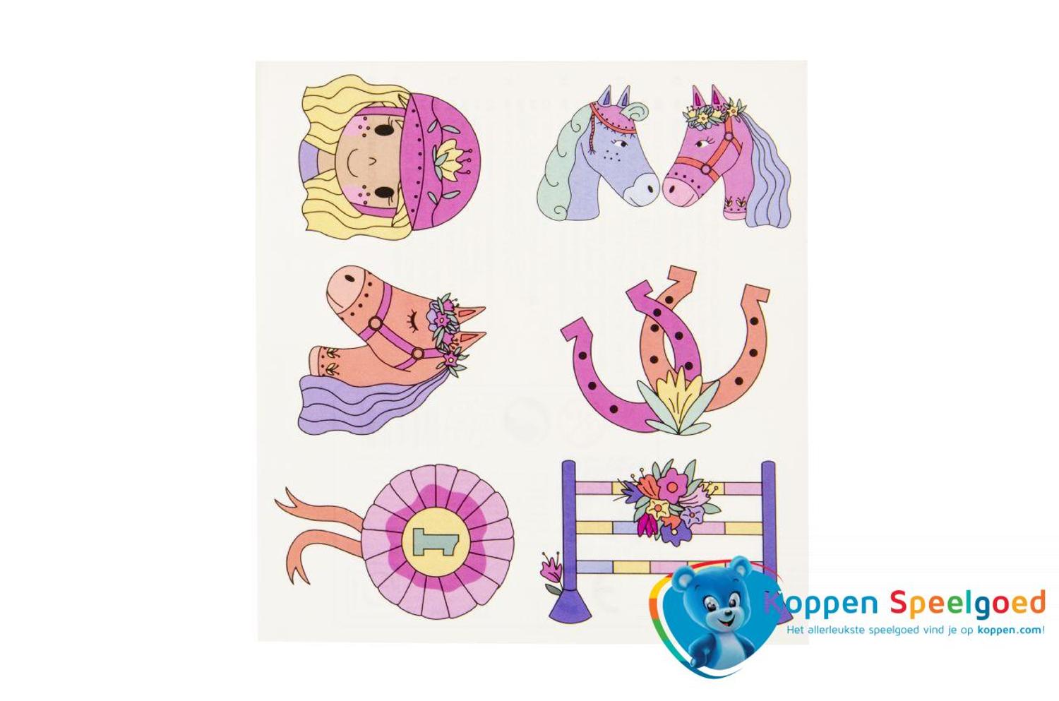 Versier je vriendjes en vriendinnetjes met deze paarden tattoo's. Met behulp van water en een spons breng je de tattoo's gemakkelijk aan. Verschillende uitvoeringen worden door elkaar geleverd. Prijs per vel.
