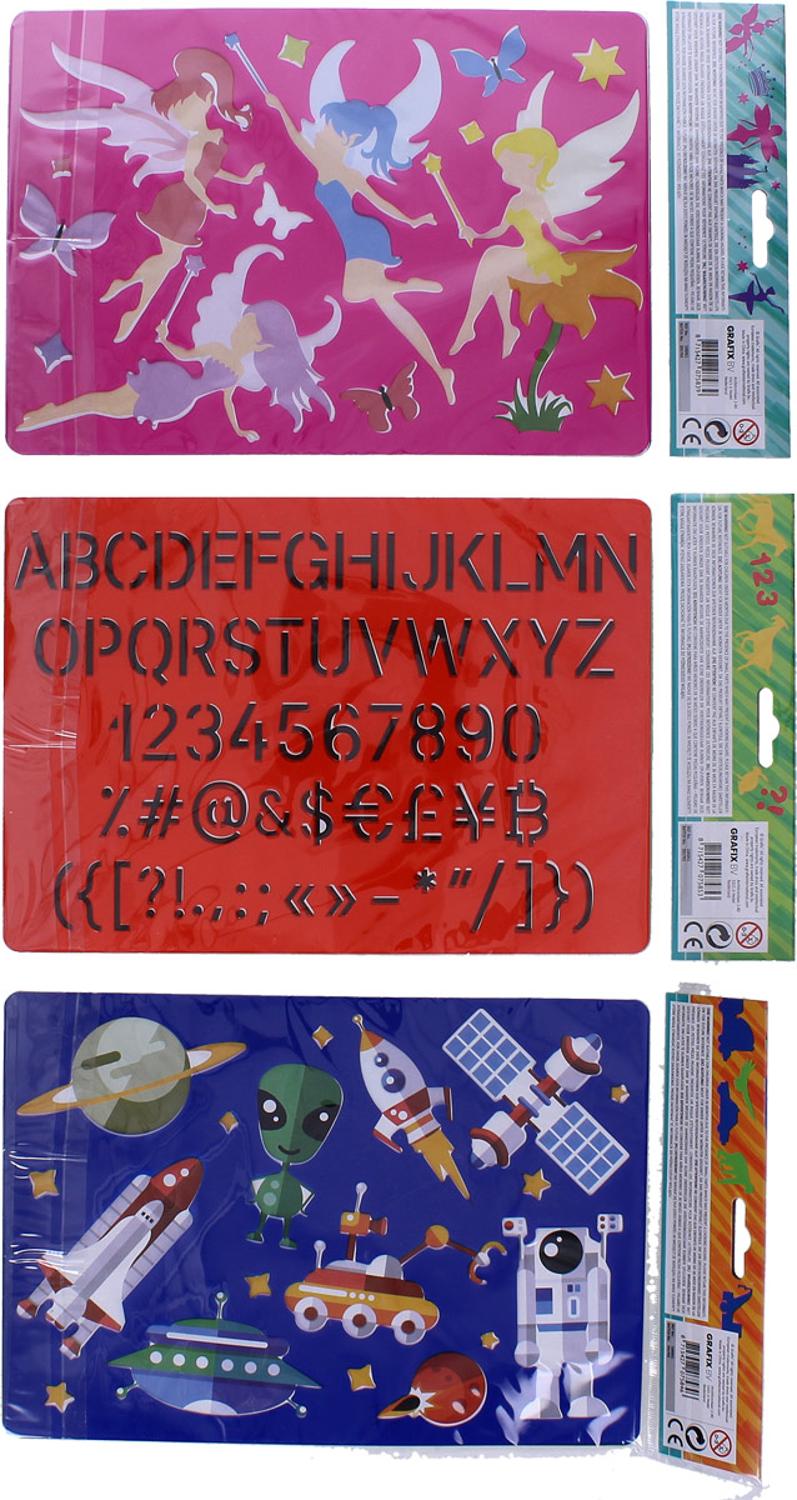 Met deze tekensjablonen (ook wel stencilvormen genoemd) maak je makkelijk complexe vormen die je daarna in kunt kleuren. Er zitten voorbeelden bij. Per set worden er 2 sjablonen en voorbeeldvellen geleverd, zie de foto's van de voor- en achterkant voor meer. Er is een set met een popfiguur met aankleedkleren en elfjes en vlinders, een set met boerderijdieren en een lettermal, en tot slot een set met voertuigen en ruimtedingen.