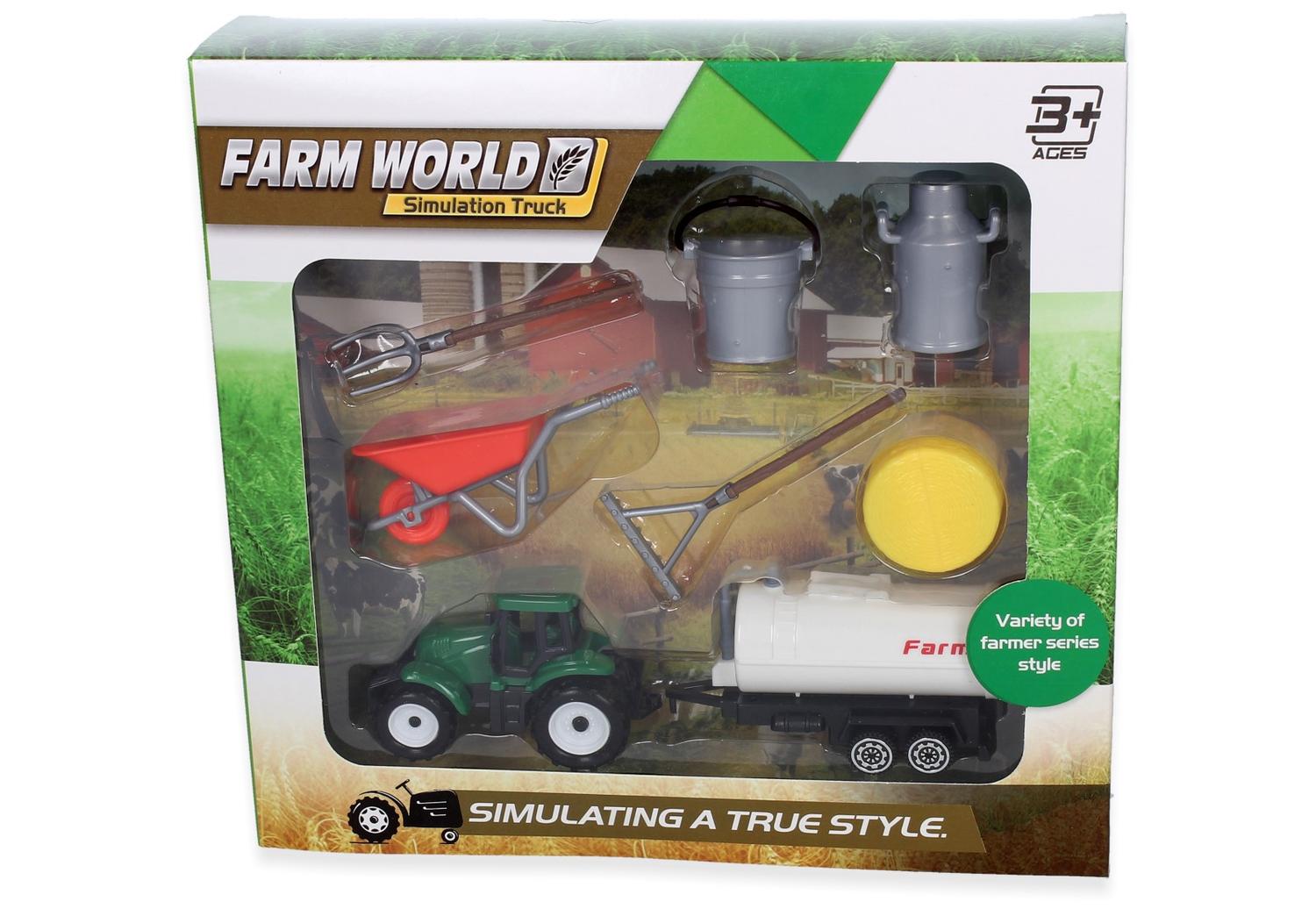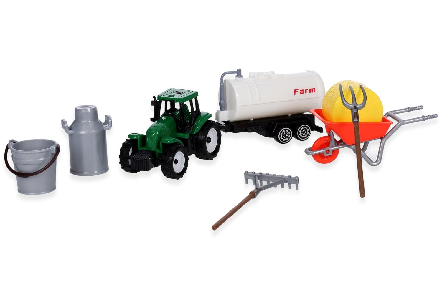 Tractor met extra aanhanger en accessoires in doos is een complete landbouwspeelset waarmee kinderen de wereld van de boerderij kunnen ontdekken. De set bevat een tractor met aanhanger, samen met diverse accessoires zoals een kruiwagen, hooibaal, melkbussen, hark en riek.