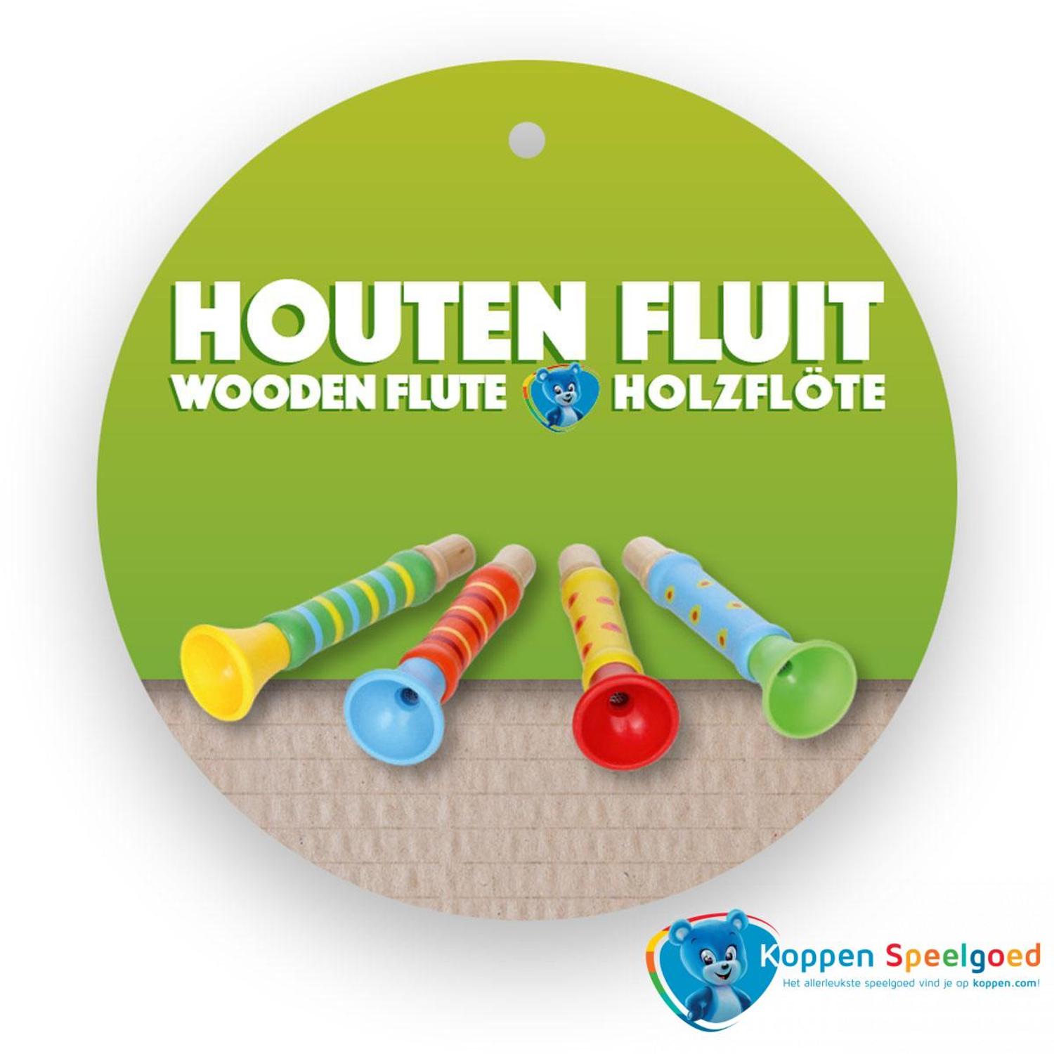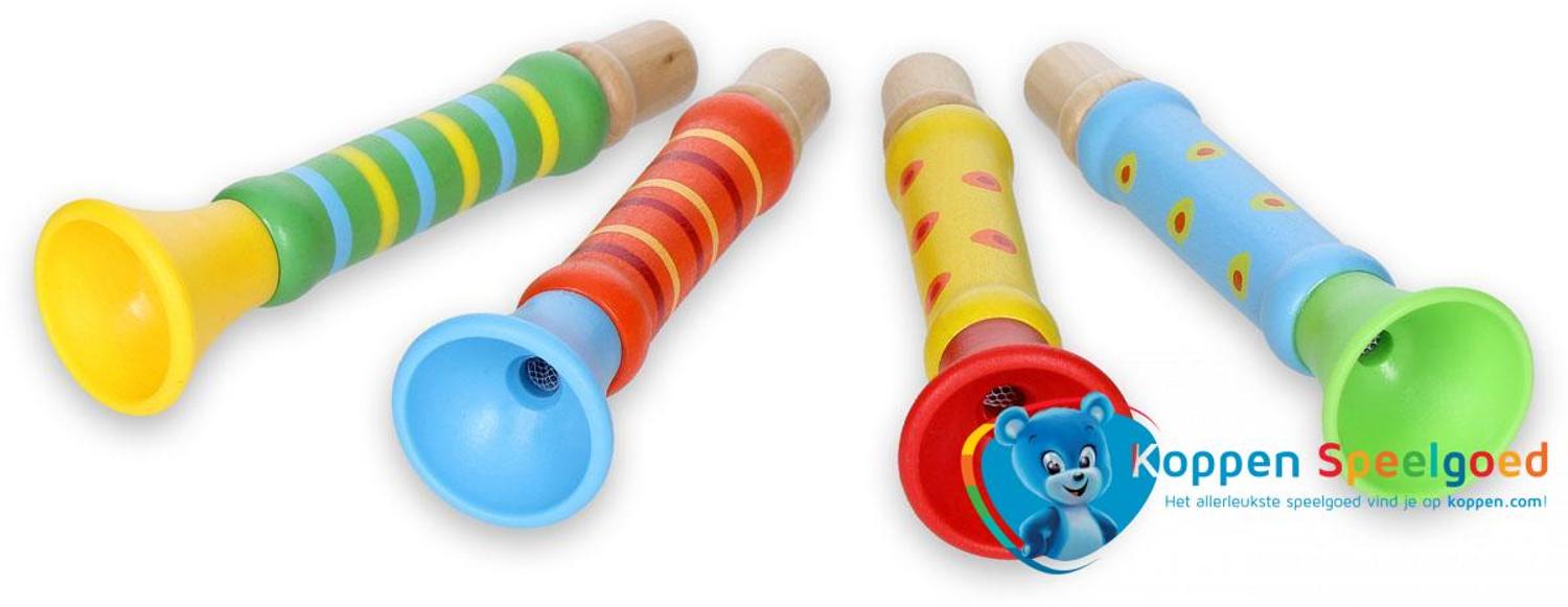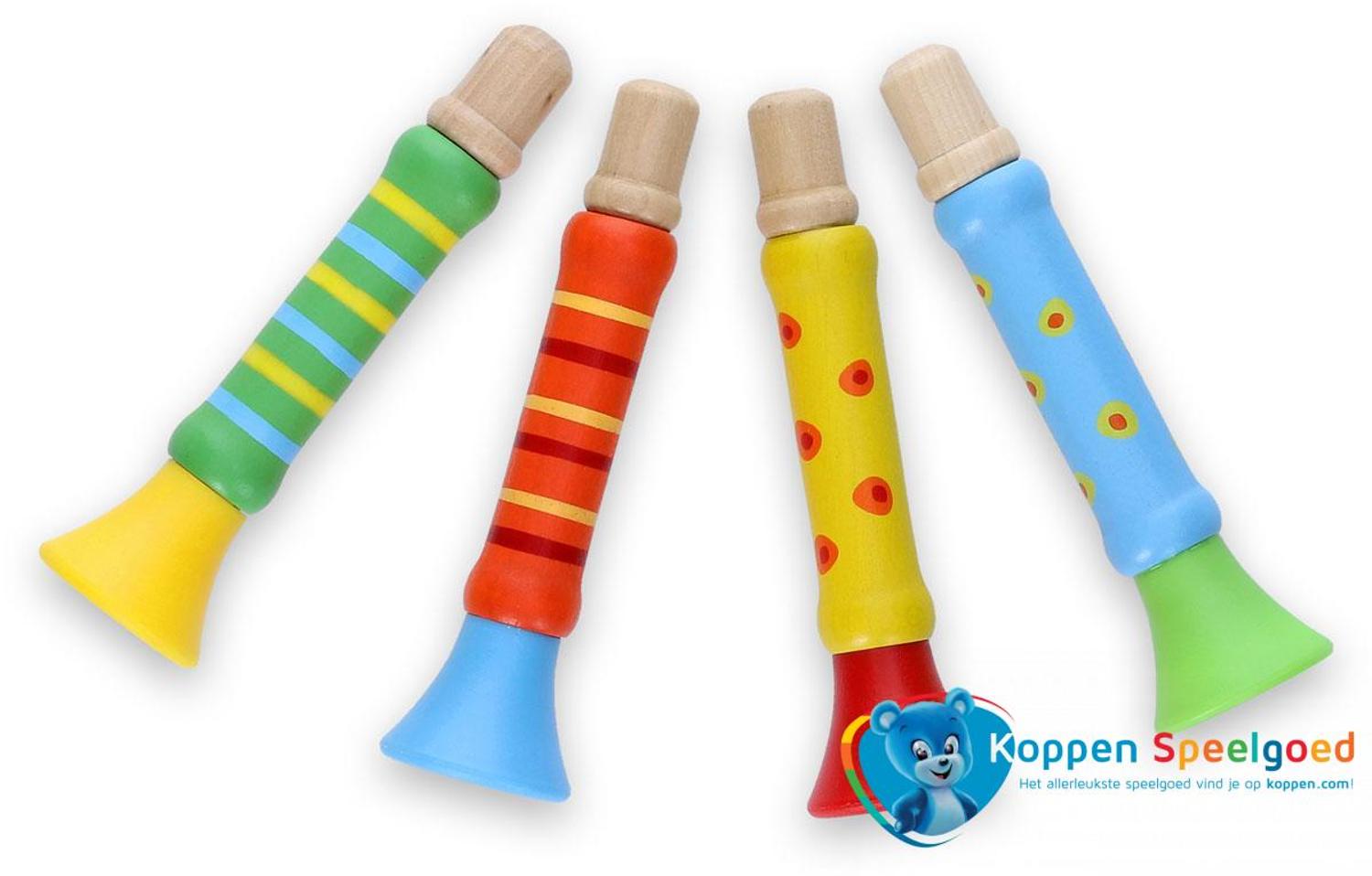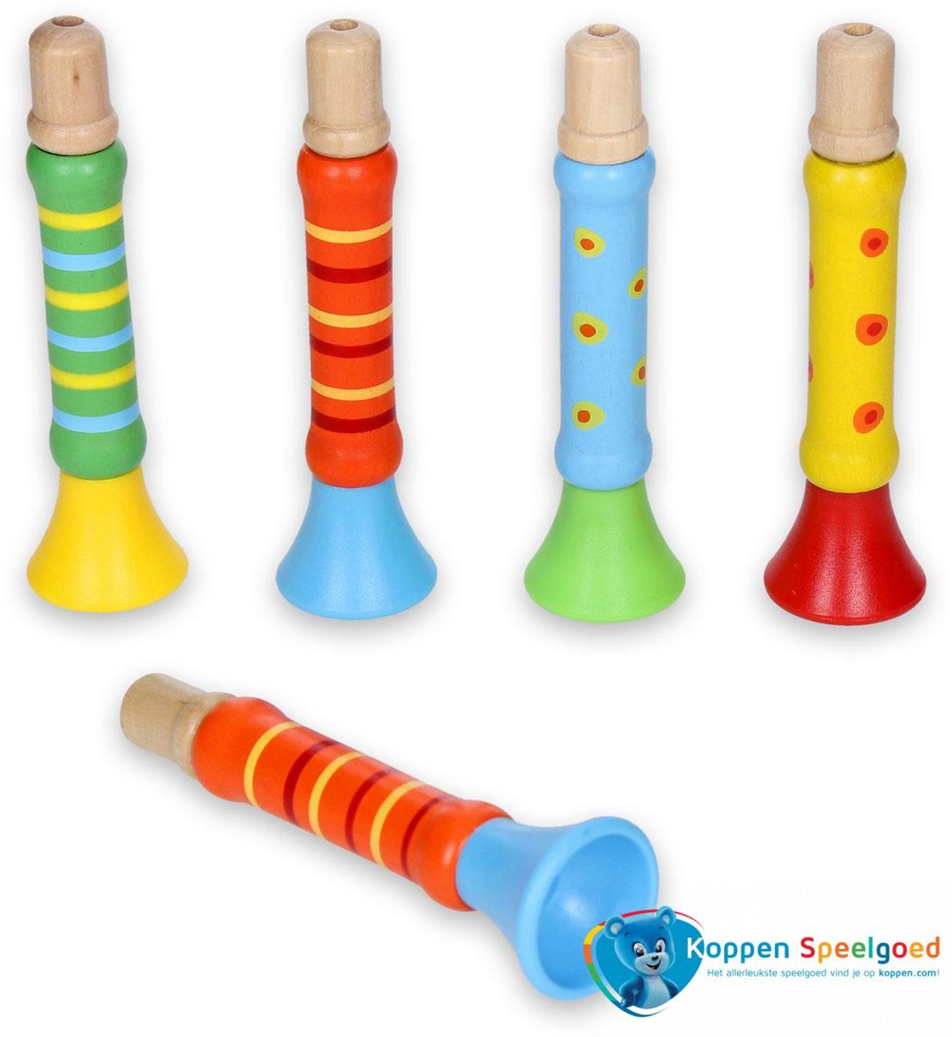 Een houten fluit in de vorm van een trompet. In vrolijke kleuren.