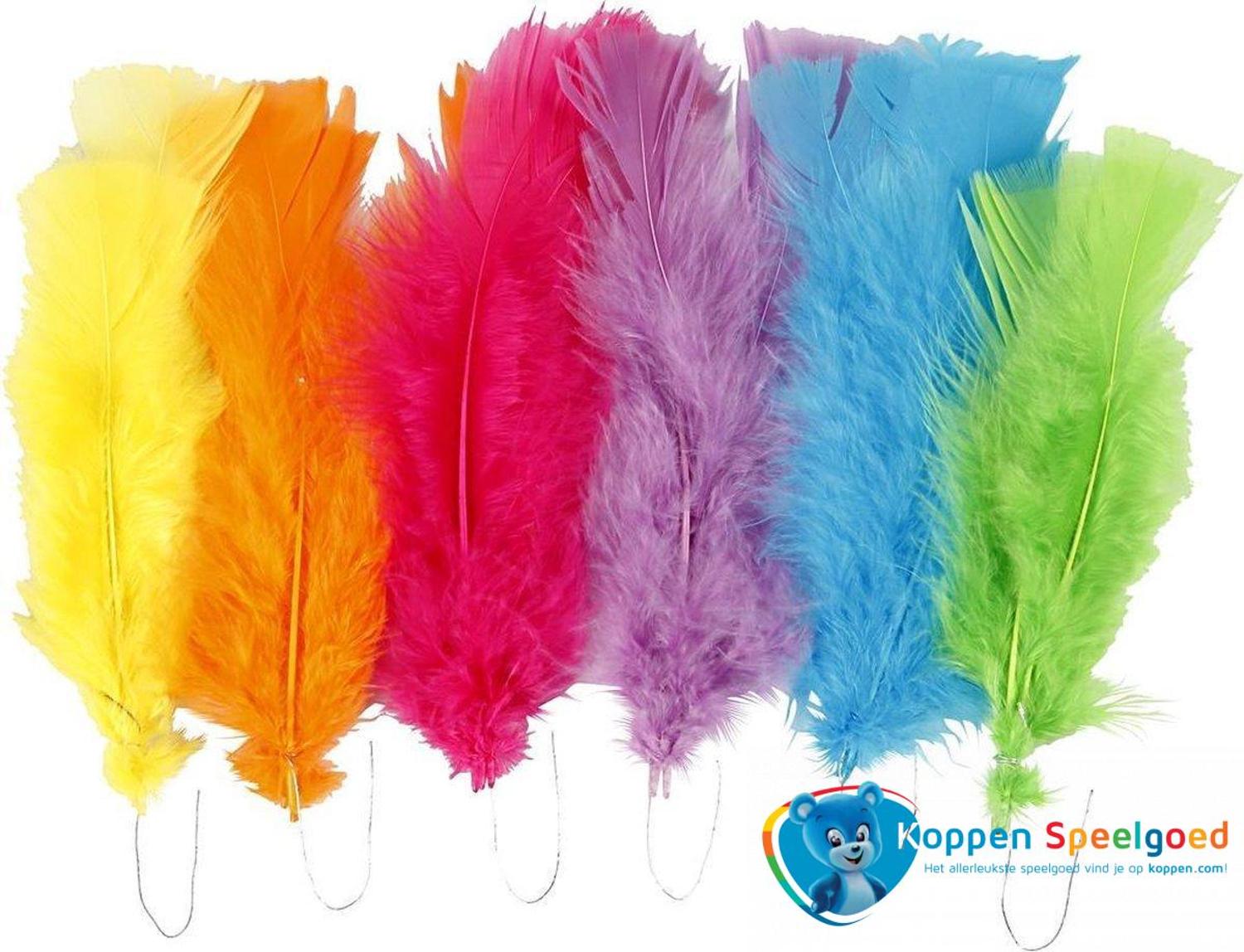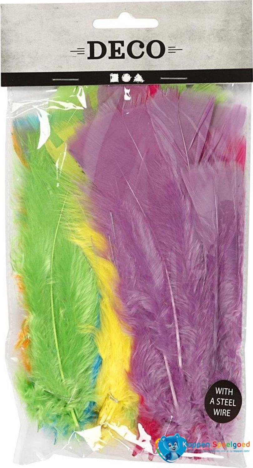 Een zakje met veren in uiteenlopende bonte kleuren, 18 stuks in het zakje. De veren hebben een lengte van 11 tot 17 cm.