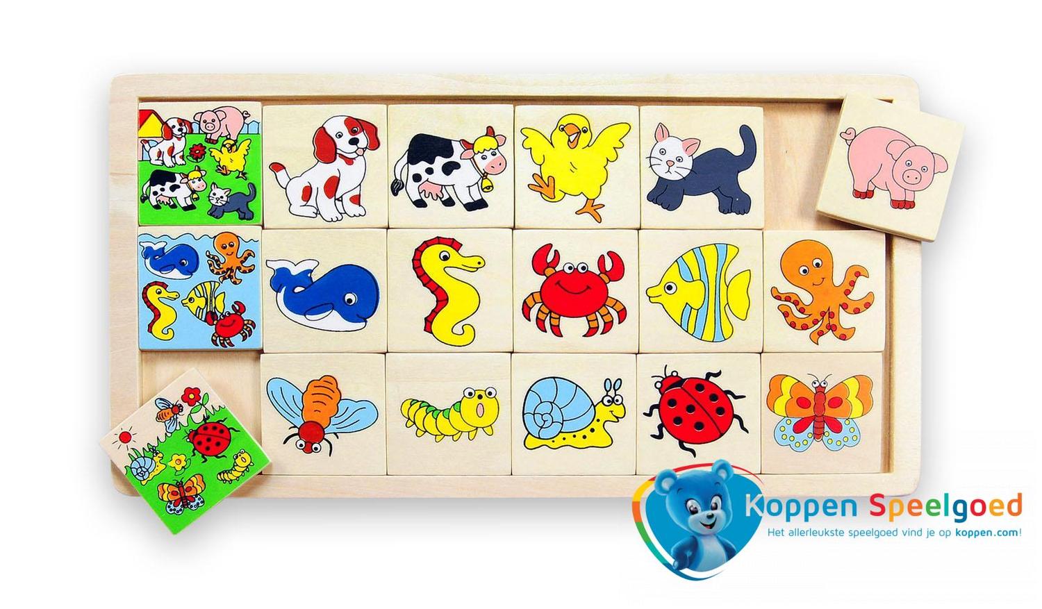 Verzamel de dieren, hout. Leg alle stukjes door elkaar. Leg dan de juiste stukjes achter elkaar op het bord. De dieren zijn per categorie ingedeeld. Dit houten speelgoed is geschikt voor kinderen vanaf 18 maanden.