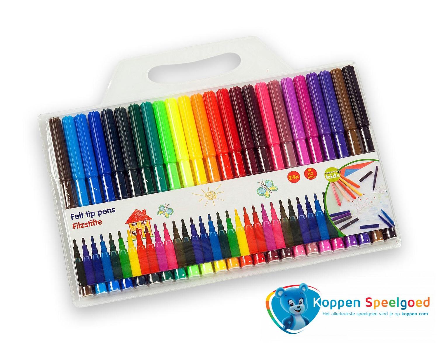 Viltstiften 24 stuks. Een set van verschillende kleuren viltstiften. Er zitten er 24 in deze tas. De diameter van de punt is 2 mm. Geschikt voor kinderen vanaf drie jaar. Onder de categorie tekenen en schilderen staan meer stiften.