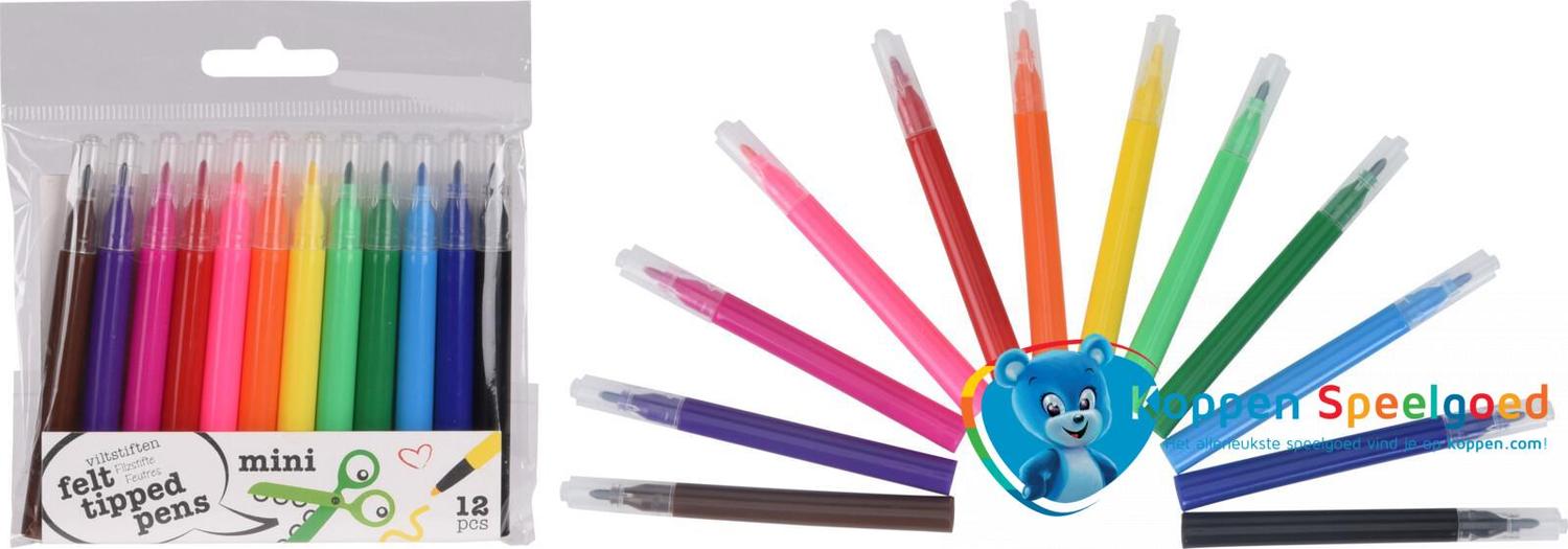 12 mini viltstiften in verschillende kleuren in een zakje. Ze zijn ongeveer 9 cm lang.