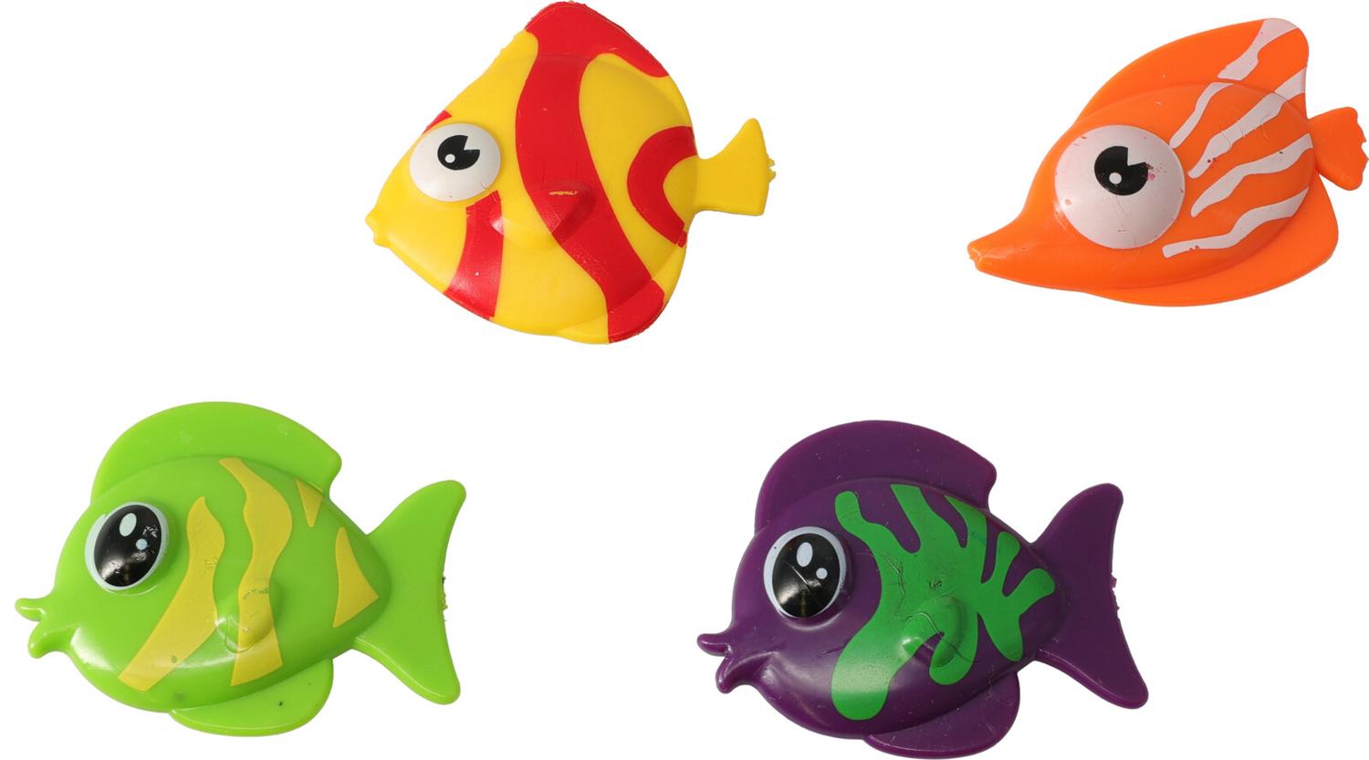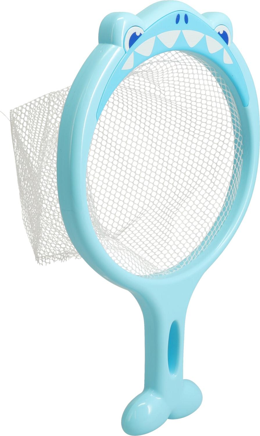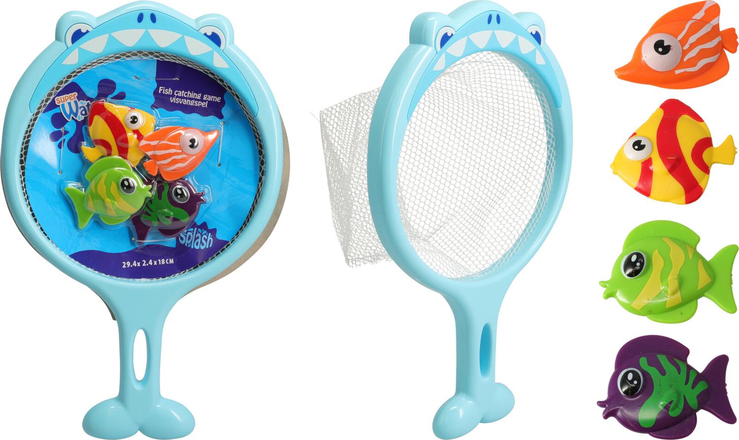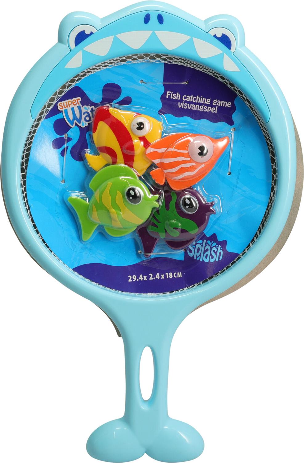 Vang de vissen met het schepnet! Leuk voor aan het water of in bad. Met vier bontgekleurde vissen en een schepnet in de vorm van een haai.