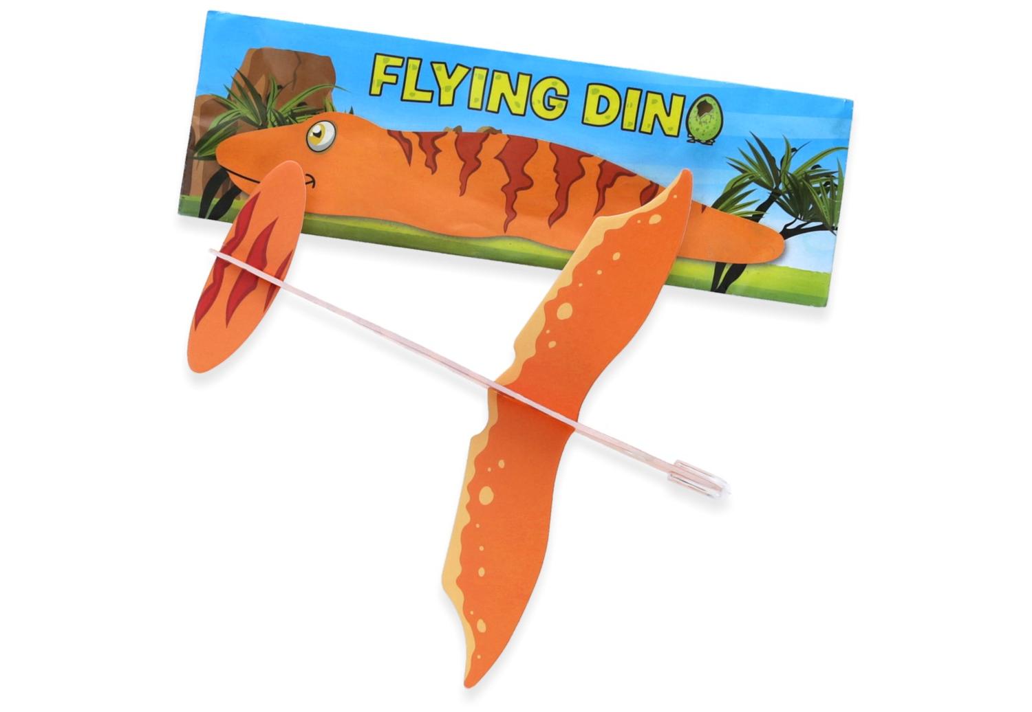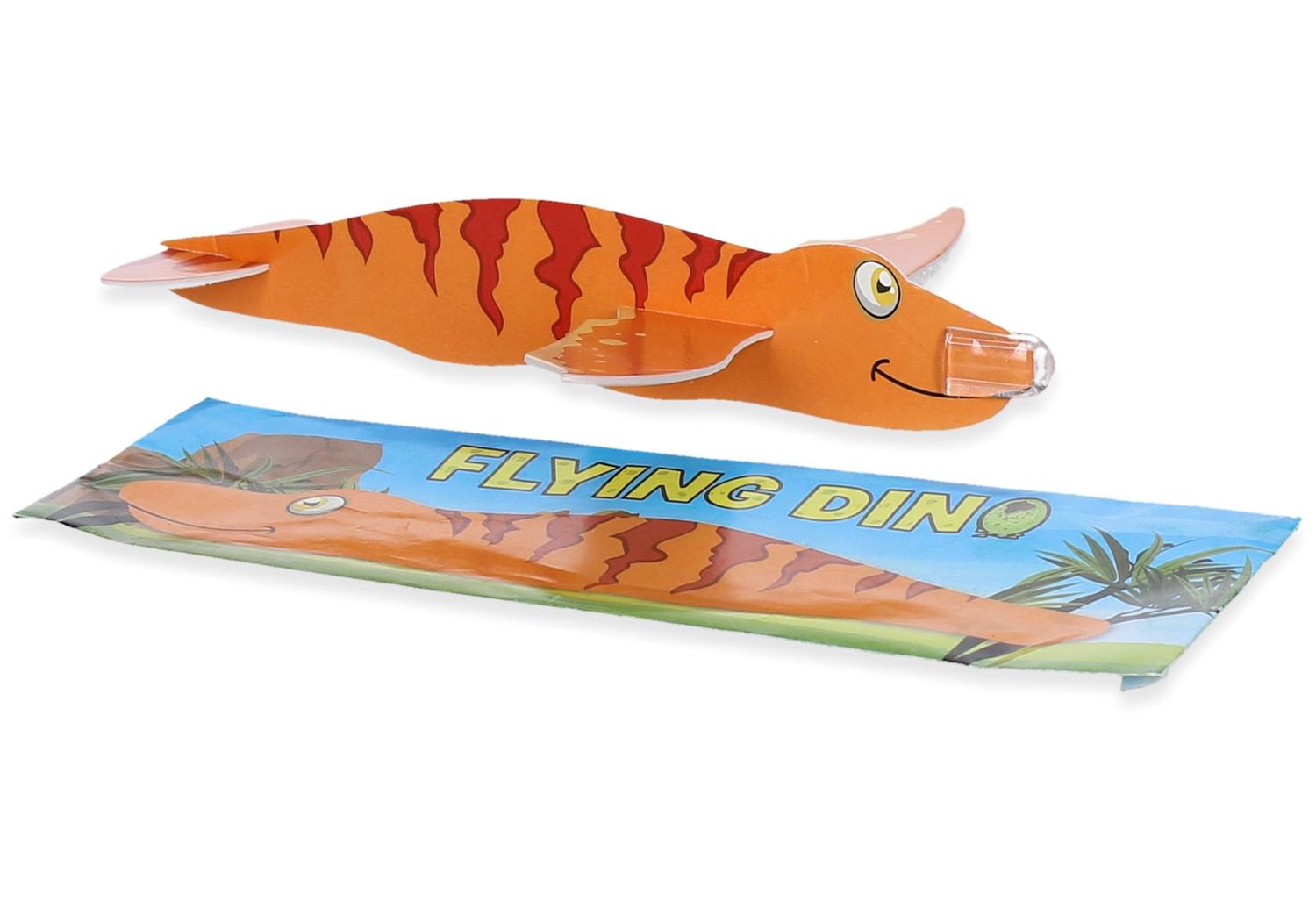 Wordt plat geleverd en is eenvoudig in elkaar te zetten. Door de dino een zwiep te geven vliegt hij sierlijk door de lucht – leuk voor zowel binnen als buiten.