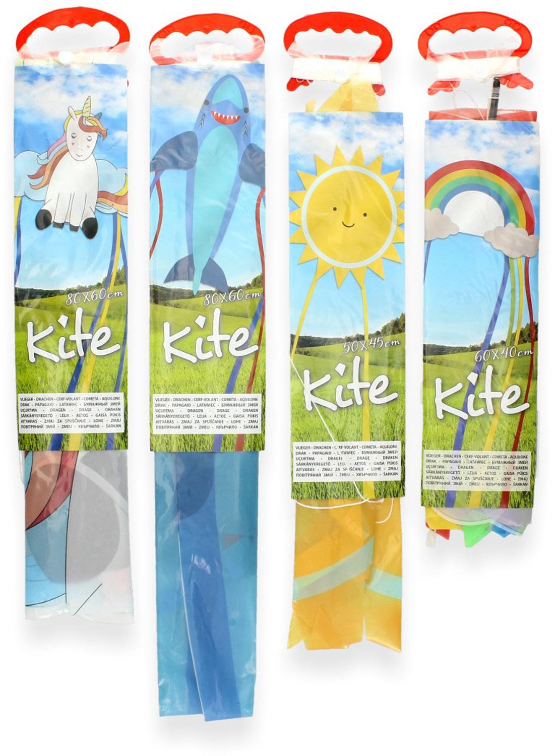 Vlieger van een haai, eenhoorn, regenboog of zon. De afmeting verschilt per model (zie foto).
