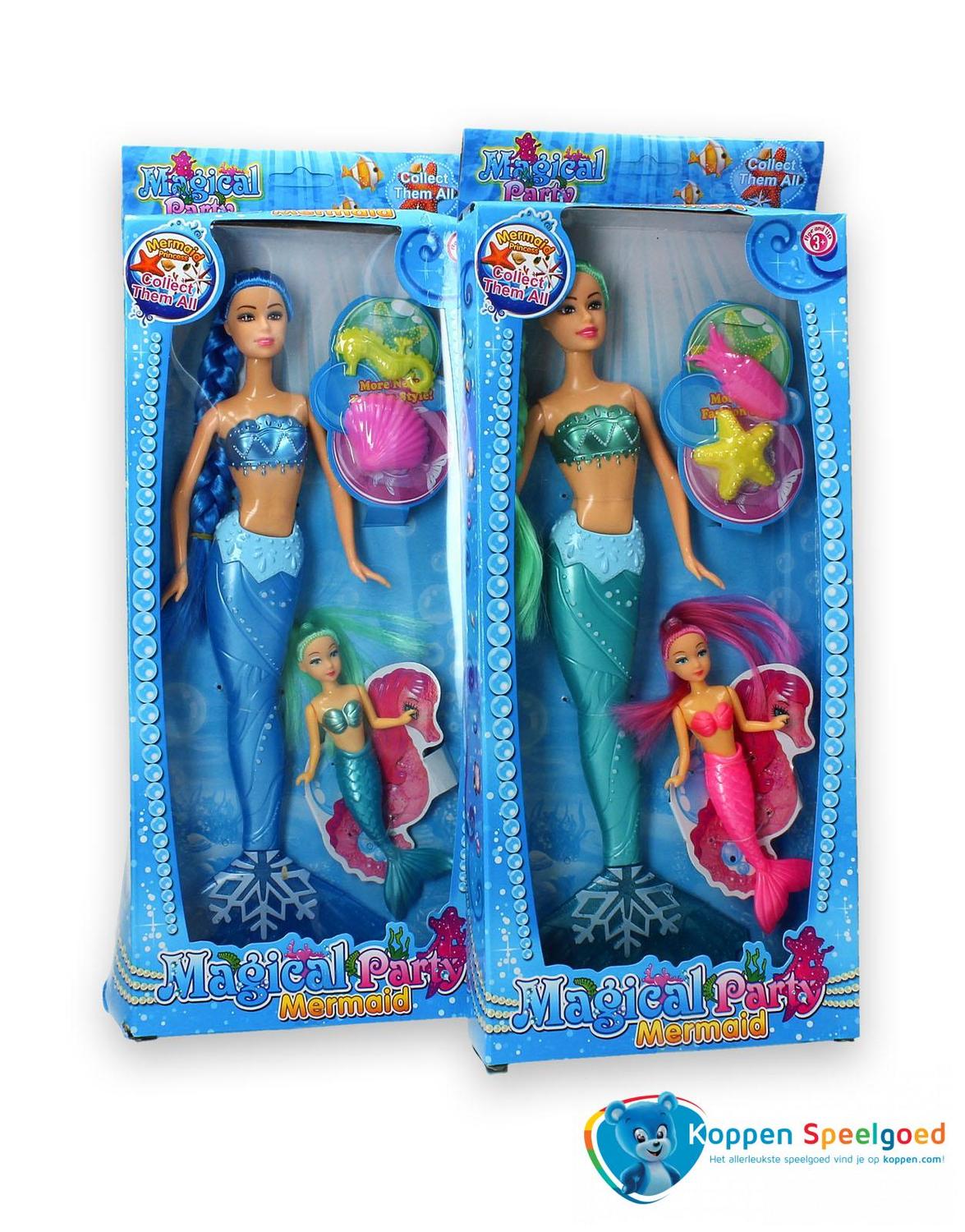 Zeemeerminnen speelset. In deze speelset zit een grote zeermeermin, een kleine zeemeermin en twee accessoires. Leuk om je poppen collectie uit te breiden. Deze speelset zit in een mooie kaart. Geschikt voor kinderen vanaf drie jaar.
