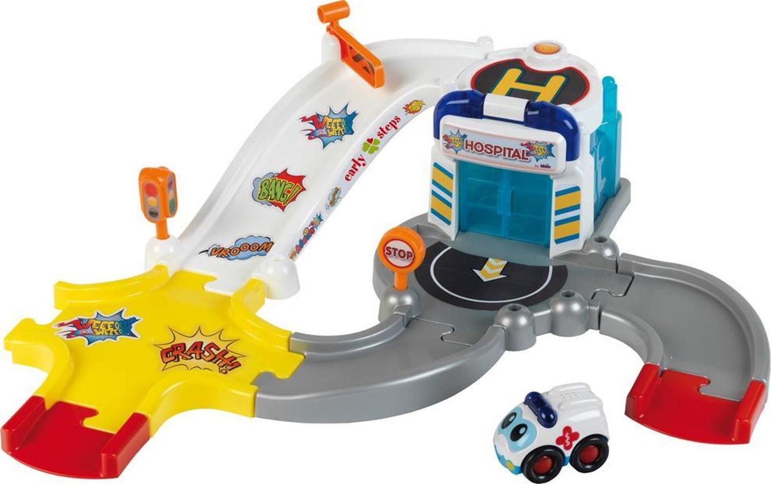 Ziekenhuis met auto. Zet zelf het ziekenhuis en de baan in elkaar. De ziekenauto maakt geluid. Geschikt voor kinderen vanaf 12 maanden. Leuk voor baby en peuter. Werkt op 4x AAA, niet inbegrepen.